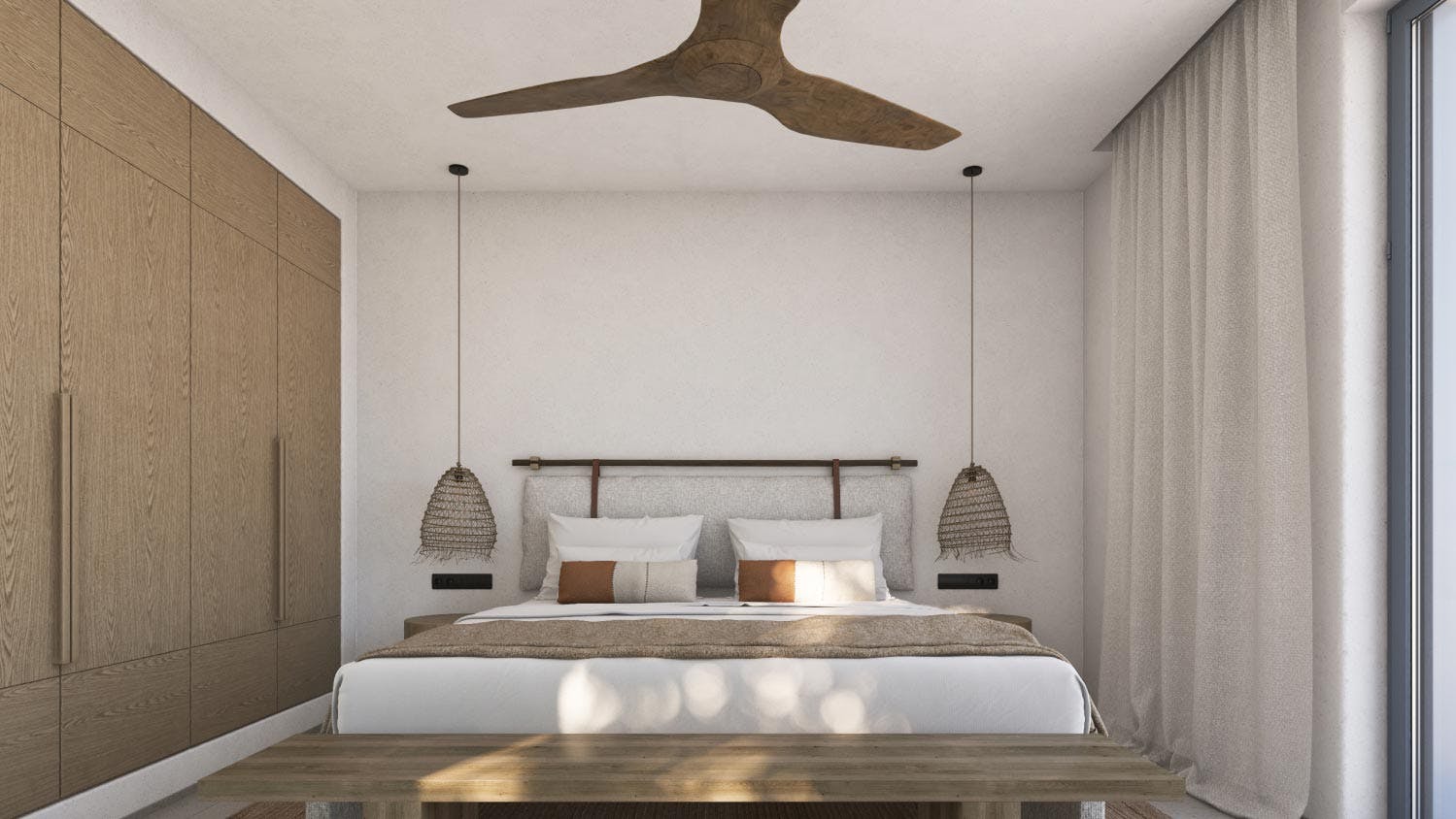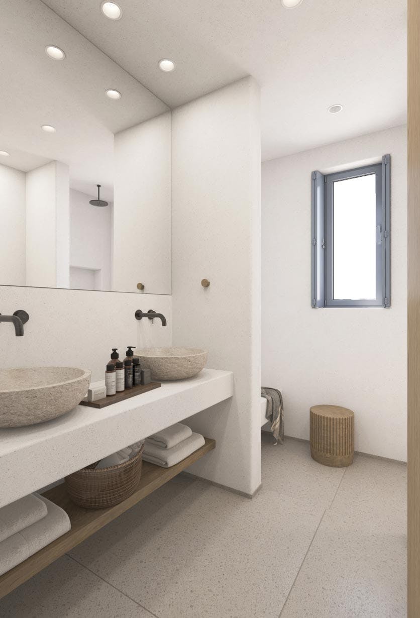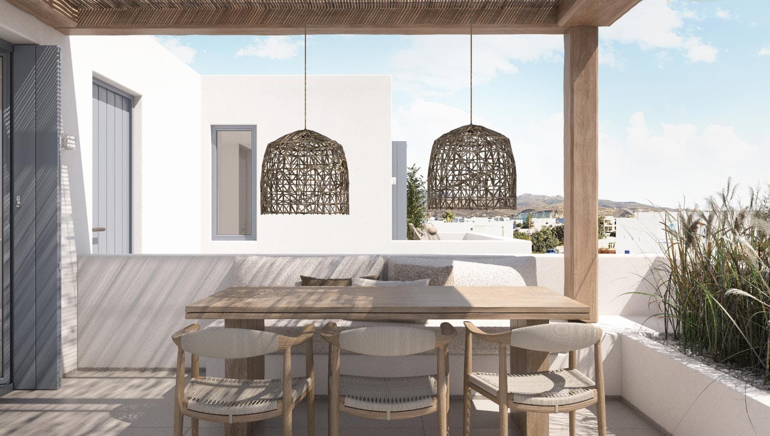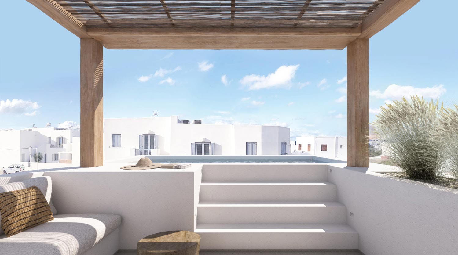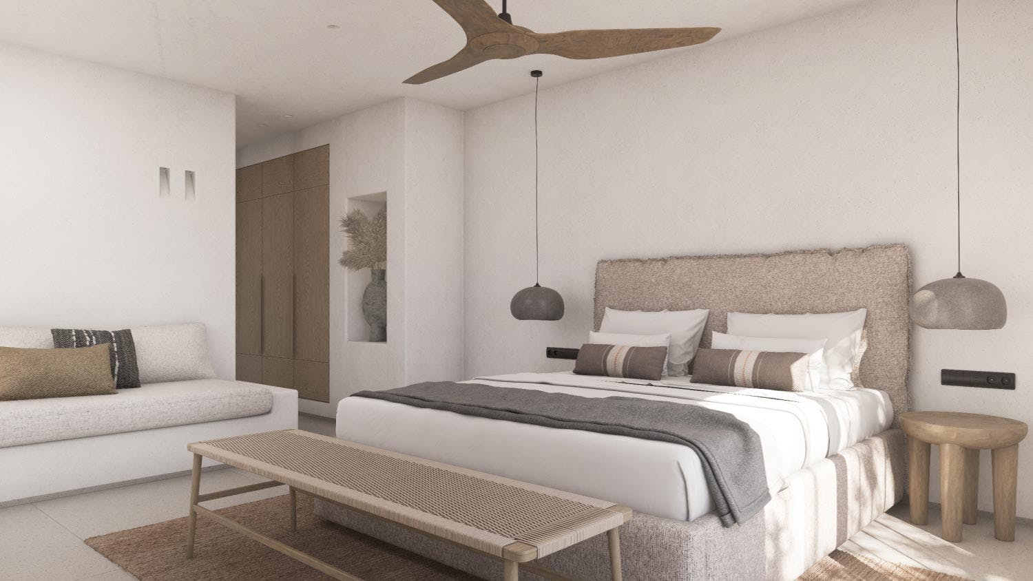 The Cycladic feeling is evident in each room through carefully designed details such as the handcrafted headboards.